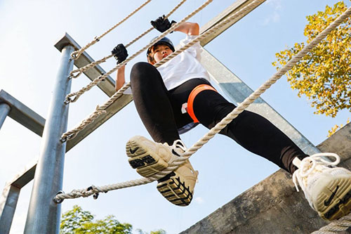 戶(hù)外拓展訓(xùn)練基地團(tuán)隊(duì)成員半空過(guò)繩索道場(chǎng)景拍攝